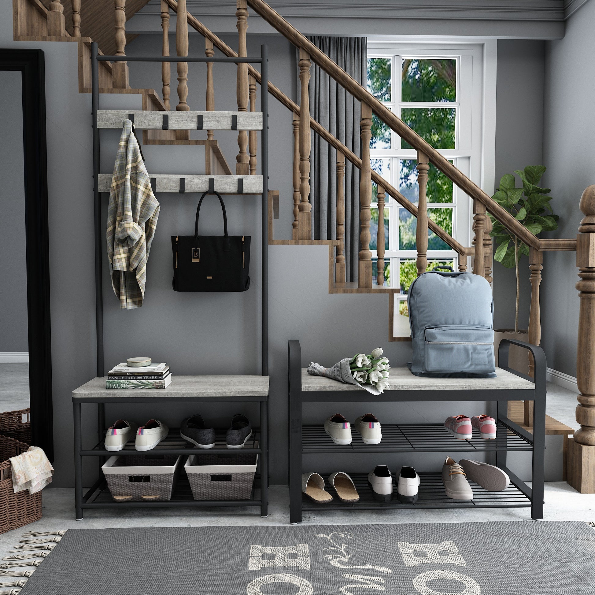 Retro Industrial Shoe Bench, Antique / Warm Grey Wood Grain Color, Multi-layer Design