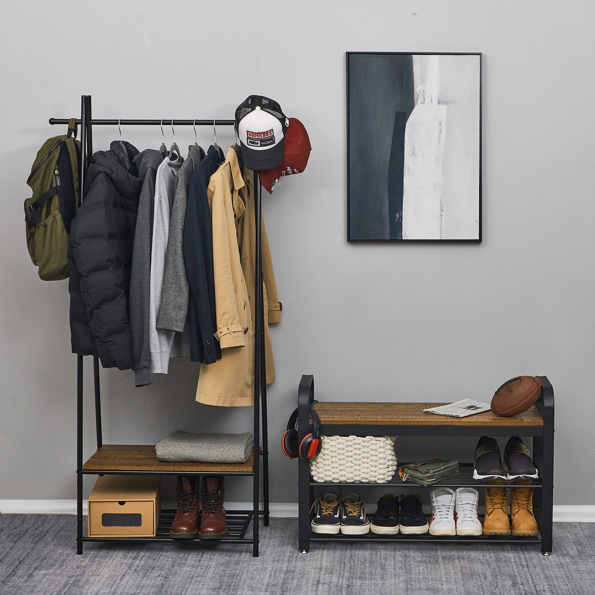- Retro design: The matching design made of black metal-iron frame and wood grain is simple and beautiful and practical. This shoe stool can be placed in the foyer or bedroom to make your home cleaner and more comfortable