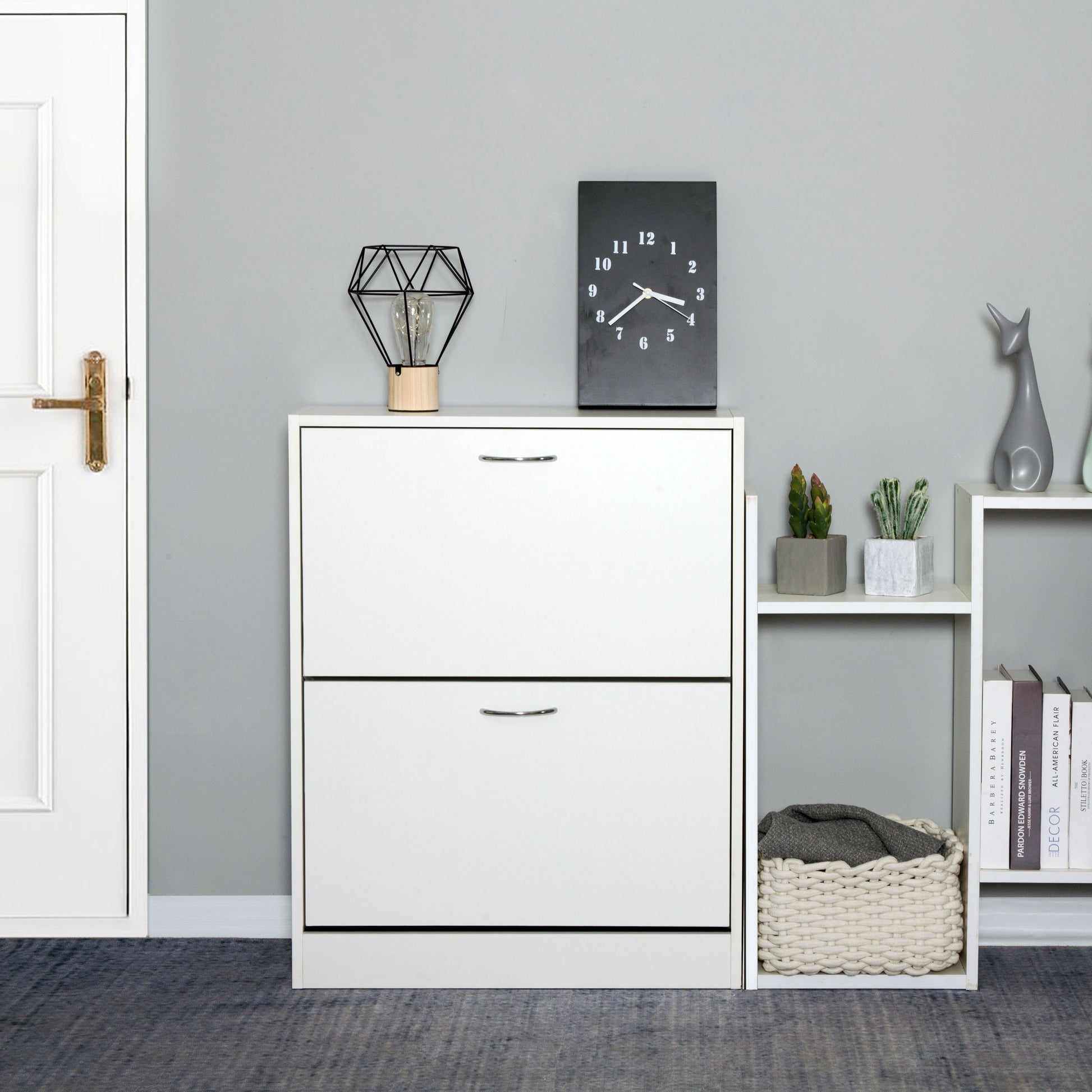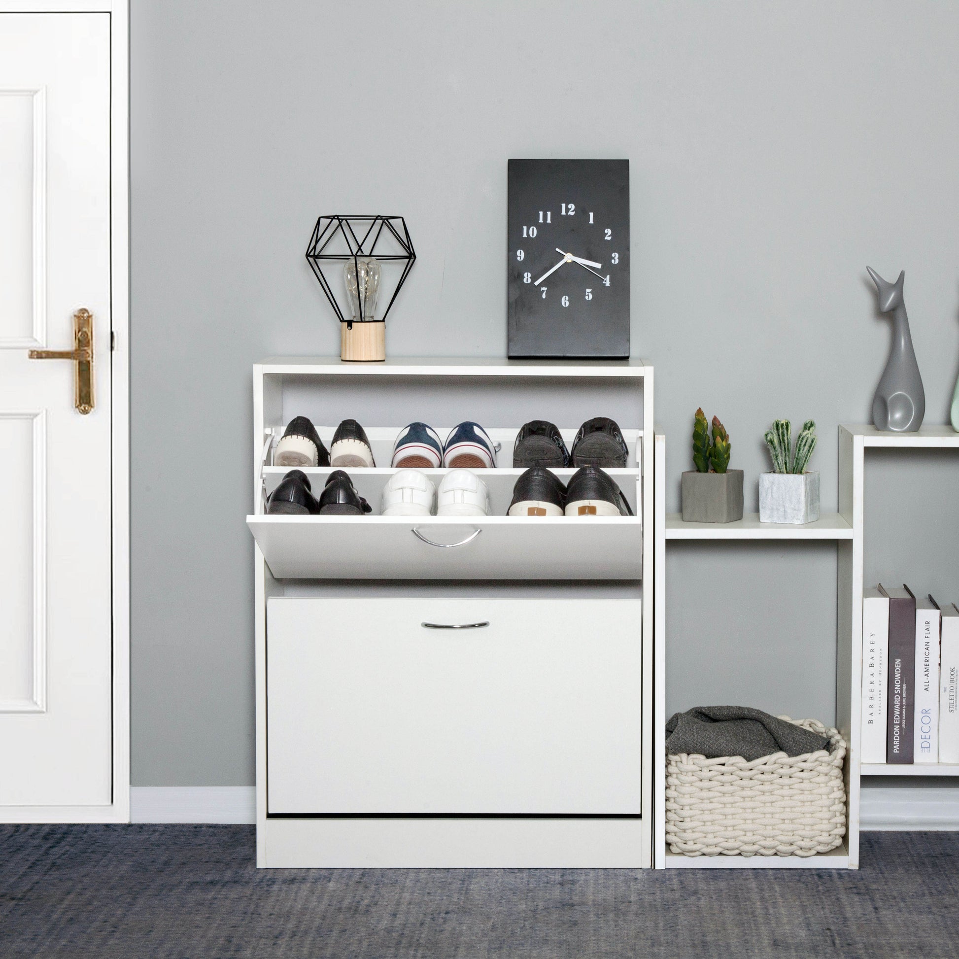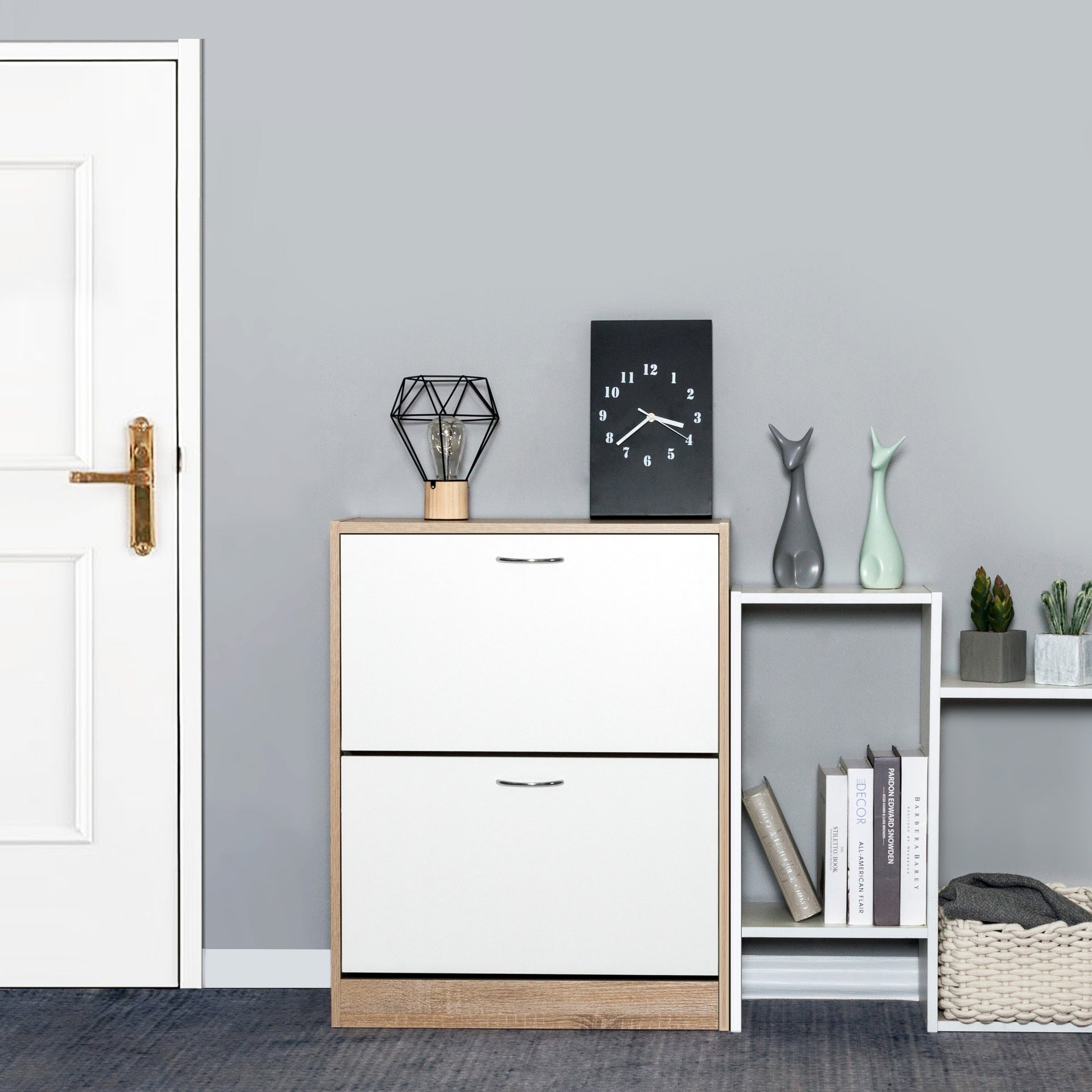 Modern Shoe Rack, Natural Wood Grain/White Color, 2 Drawer Flaps