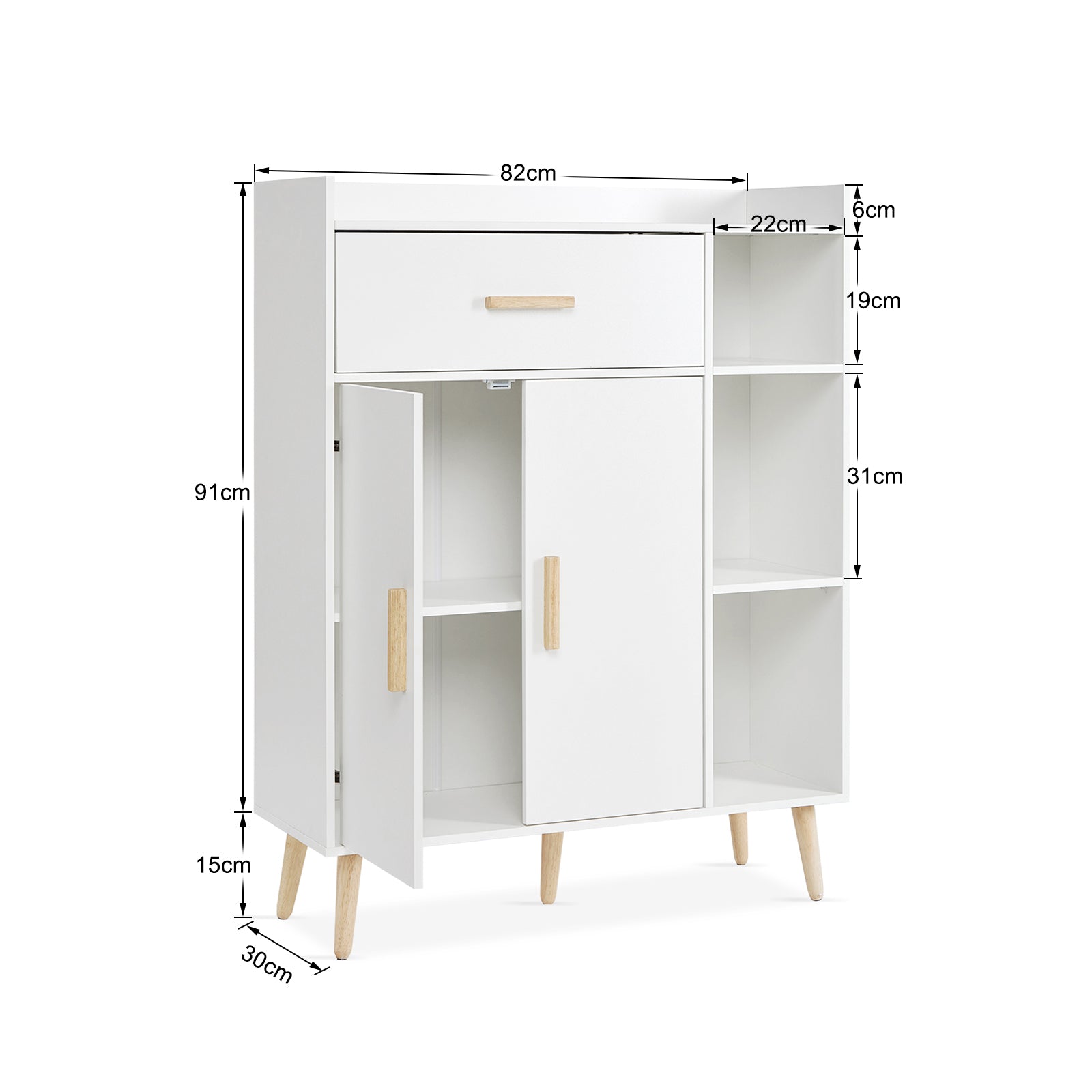 - Stable Structure – The sideboard storage cabinet is made of particleboard, with an anti-toppling device on the backside and solid wood legs at the bottom to ensure its stability.