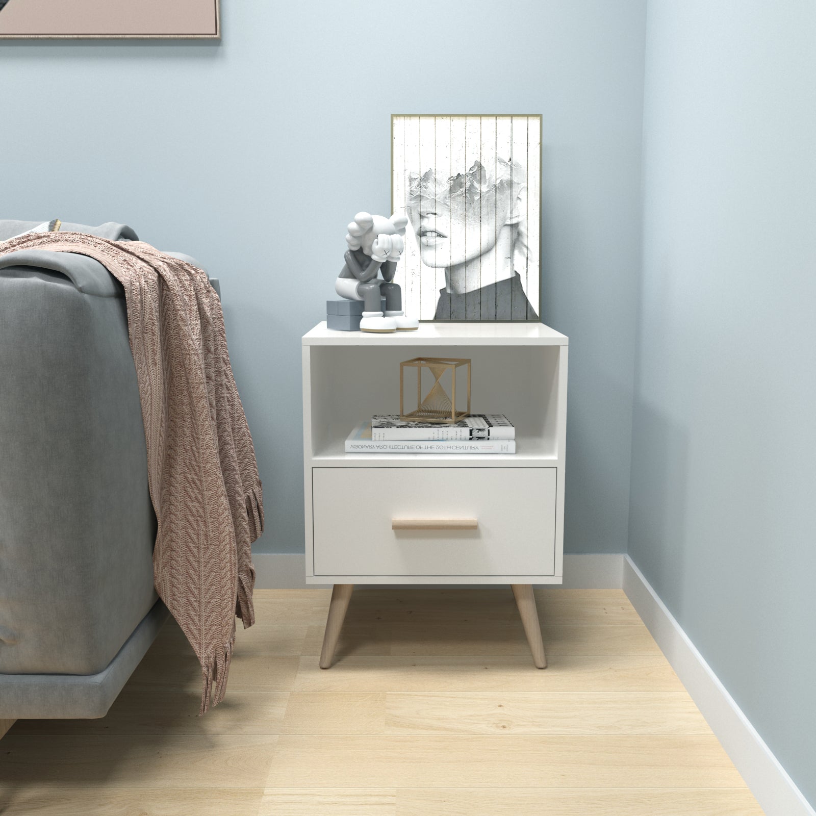 - The nightstand is designed with open storage space and a slide-out drawer with a handle that considers both convenience and privacy. It is very suitable for storing books, photos, decorative items, etc.
